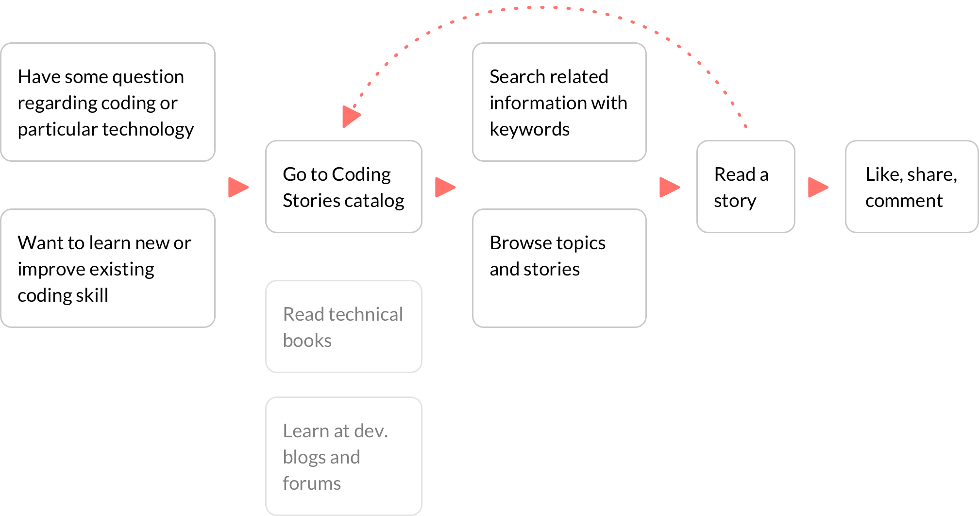 To present Coding Stories as an independent separate product for users we collected all the sources in one place, accessible for everyone from everywhere. We created a landing page, which helps to increase visibility on the market and address value for both types of existing and future users. Wrapping up the result of a discovery phase gave us the main benefits that we could communicate and set a tone of voice for the audience in general.