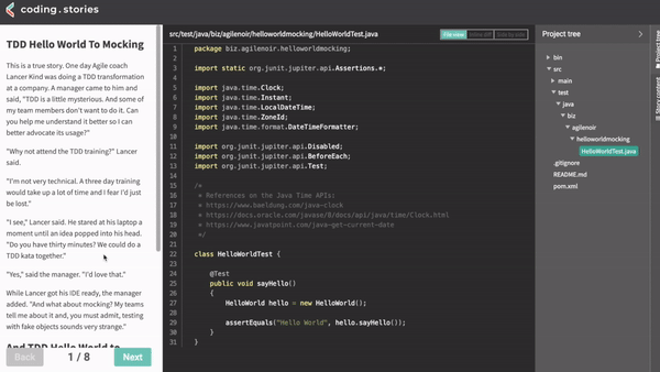 Coding Stories are resposi-stories — step-by-step guides where every action is a story page with a clear explanation documented as text and the actual code changes illustrated through visualizations.